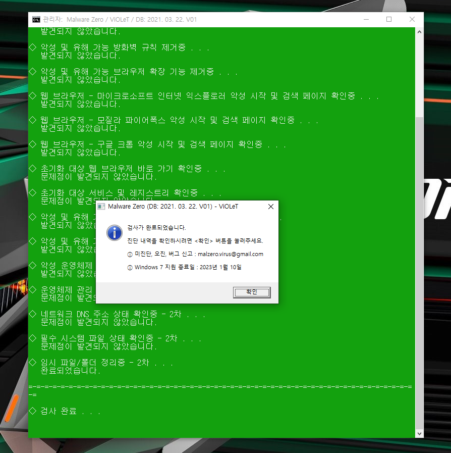 그 다음으로는 레지스트리, 그리고 여타 다른 악성코드까지 싹 날려준다고 알려져 있는 멀웨어 제로 입니다. 한번 실행하면 생각보다 시간이 걸리는 편이니... 구라제거기와는 달리 시간이 좀 있을 때 사용해야 할 것 같네요.