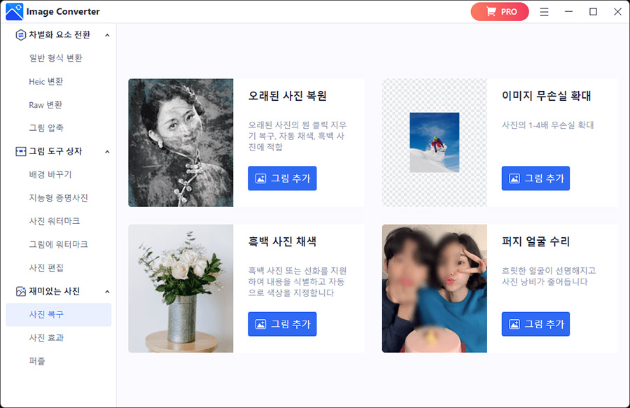 ๋ง์ง๋ง์ผ๋ก ์ ๊ฐ ํ ์คํธํด๋ณธ ๊ธฐ๋ฅ์ WorkinTool Image Converter์์ ๊ฐ์ฅ ํฅ๋ฏธ๋ก์ ๋ณด์ด๋ ๊ธฐ๋ฅ๋ค์ด์๋๋ฐ์. ์ฌ๊ธฐ์๋ ์ค๋๋ ์ฌ์ง์ ๋ณต์ํ๊ฑฐ๋, ํ๋ฐฑ ์ฌ์ง์ ์ฑ์ํ๊ฑฐ๋, ์์ ์ด๋ฏธ์ง ํ์ผ์ ํ์ง ์์ ์์ด ํฌ๊ฒ ๋๋ฆฌ๊ฑฐ๋, ํ๋ฆฟํ๊ฒ ๋์จ ์ผ๊ตด ์ฌ์ง์ ์ ๋ช ํ๊ฒ ๋ง๋๋ ๊ฝค ๋๋ผ์ ๋ณด์ด๋ ๊ธฐ๋ฅ๋ค์ด ์์ต๋๋ค.