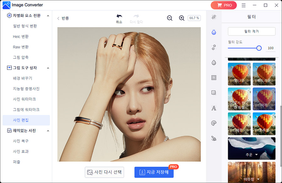 ์ถ๊ฐ์ ์ผ๋ก ์ฌ์ง์ด๋ฏธ์ง๋ฅผ ๊ทธ๋ฆผ ์ฒ๋ผ ๋ง๋ค๊ฑฐ๋, ๋์ด๋ฅผ ์ด๋ฆฌ๊ฒ ๋๋ ๋์ด๋ค๊ฒ ๋ง๋ค๊ธฐ, ๋จ์๋ฅผ ์ฌ์์ฒ๋ผ ๋๋ ๊ทธ ๋ฐ๋๋ก ์ฌ์๋ฅผ ๋จ์์ฒ๋ผ ๋ฐ๊ฟ์ฃผ๋ ์ฌ๋ฐ๋ ์ฌ์ง ํจ๊ณผ ํํฐ๋ค๋ ์์ต๋๋ค.